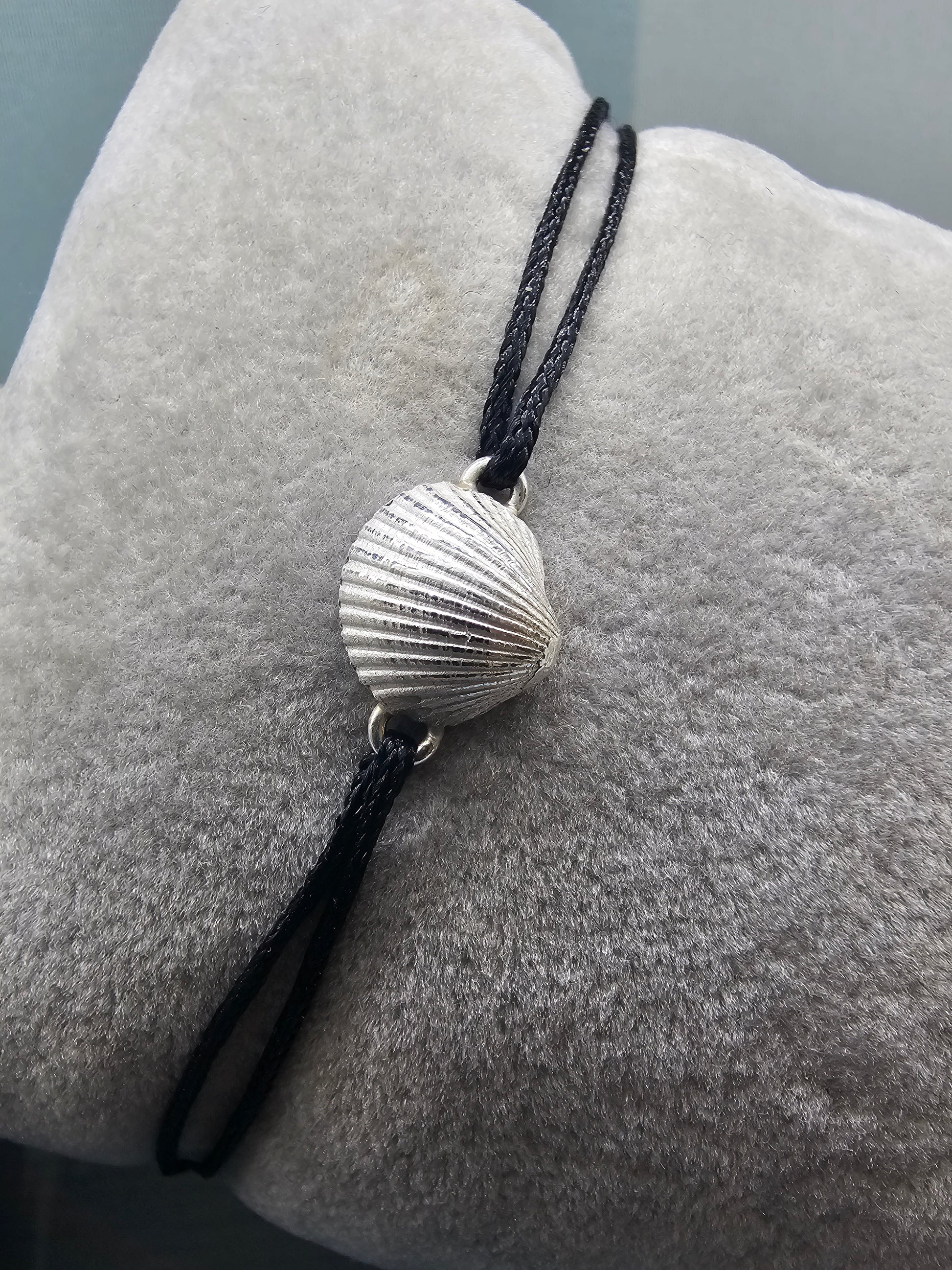 Die kleine Herzmuschel aus Wassersleben in 935/- Silber und Textilband für den Arm