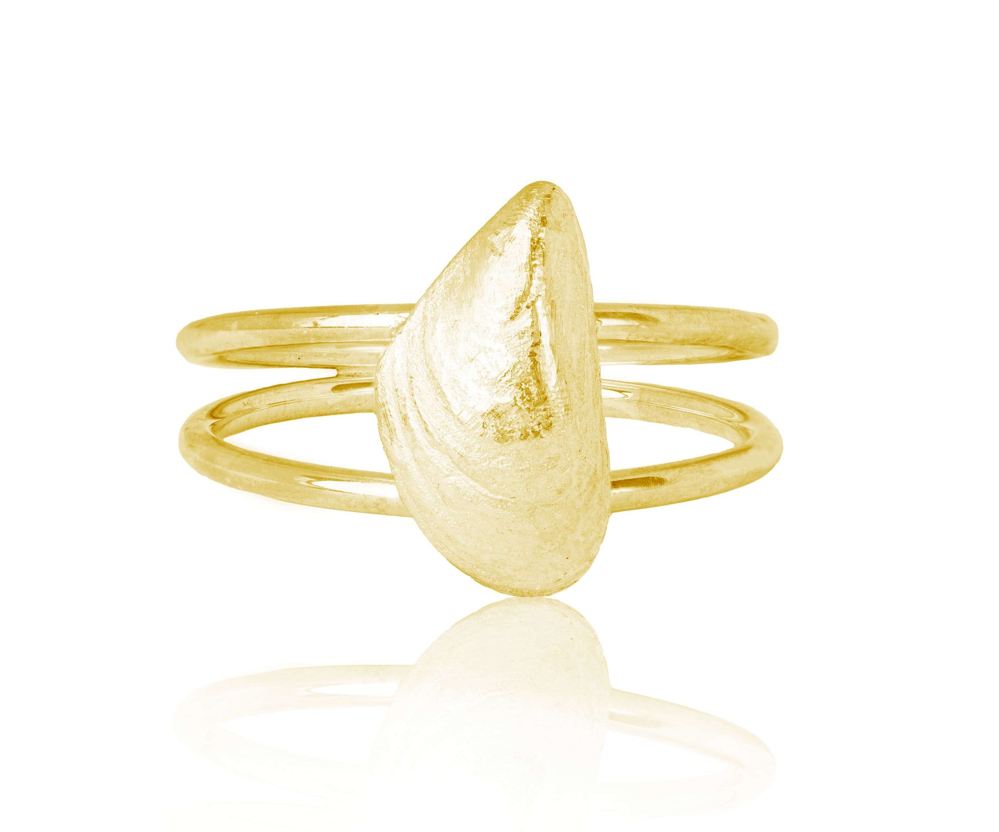 Die kleine Miesmuschel aus Glücksburg in 585/- Gelbgold als Fingerring auf doppelter Ringschiene in 585/- Gelbgold in den Ringweiten 50, 52, 54, 56, 58, und 60.