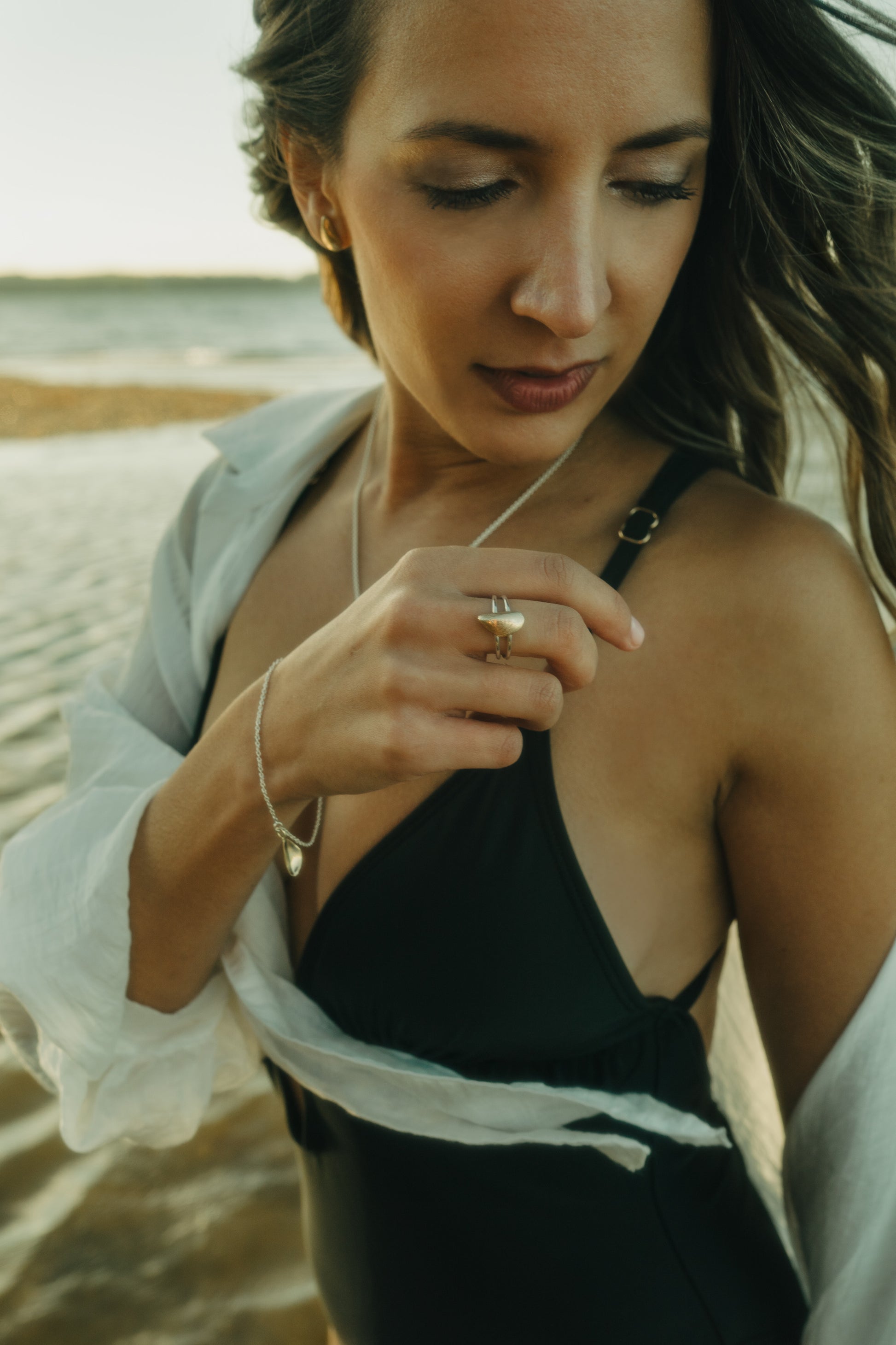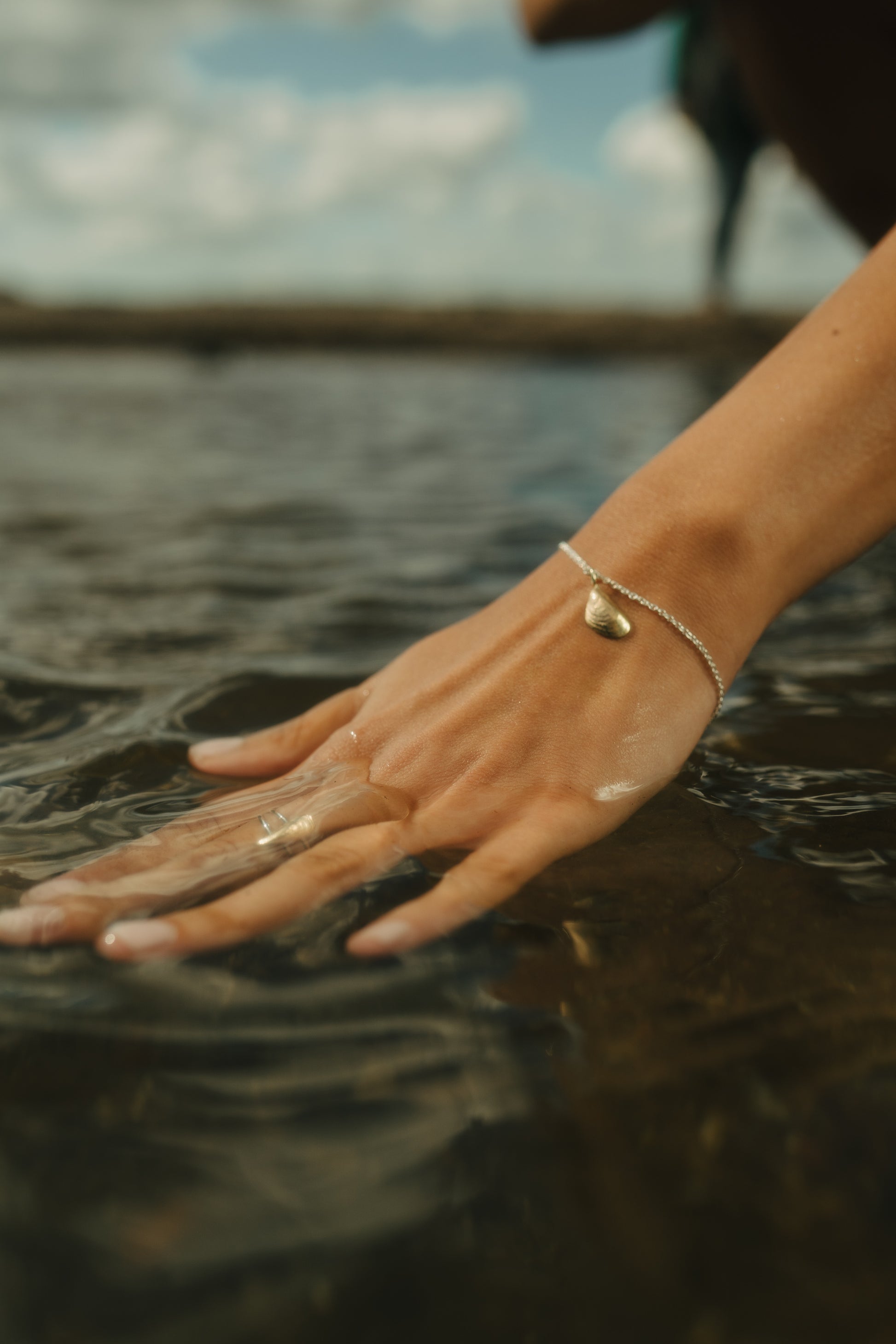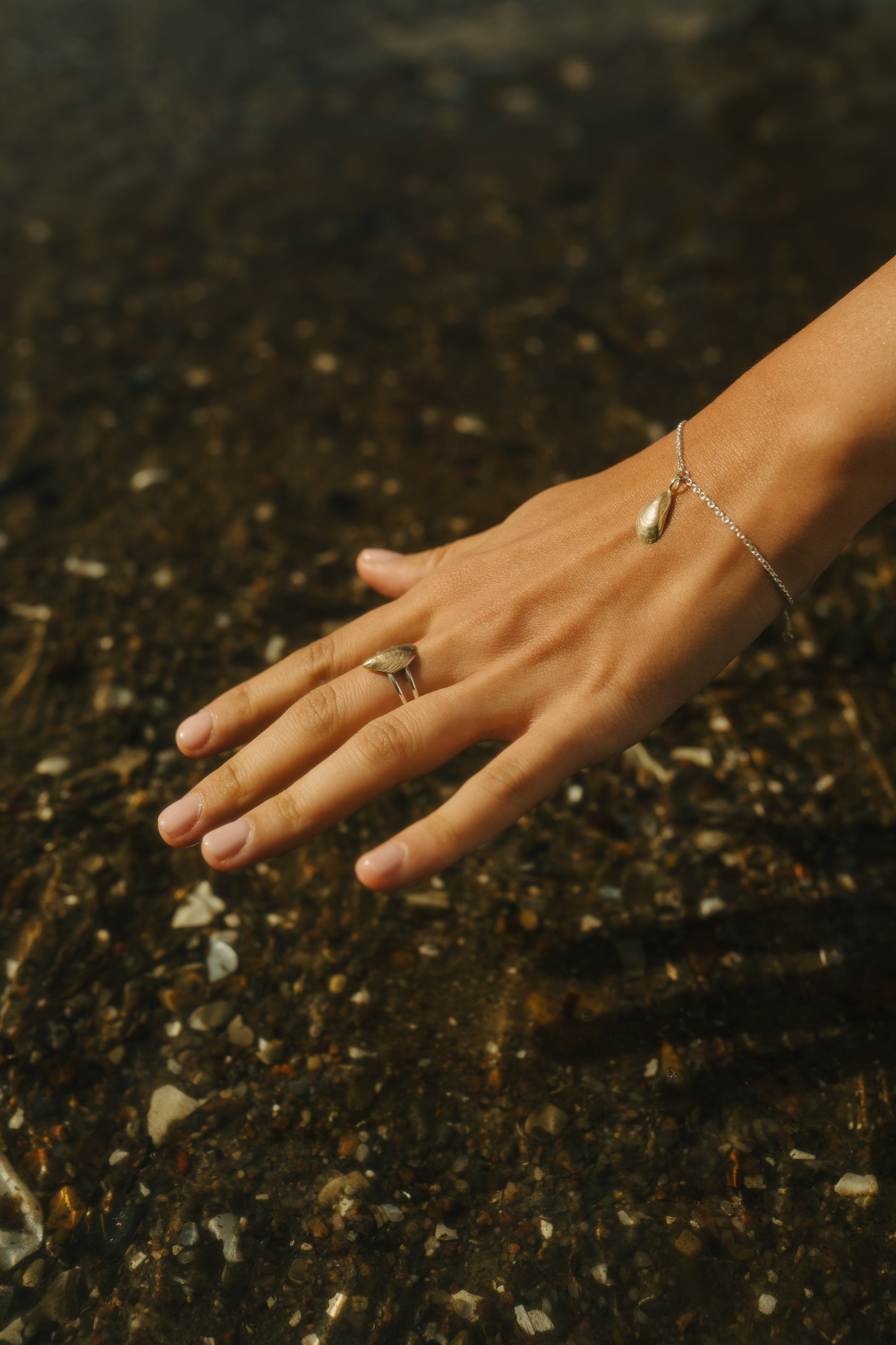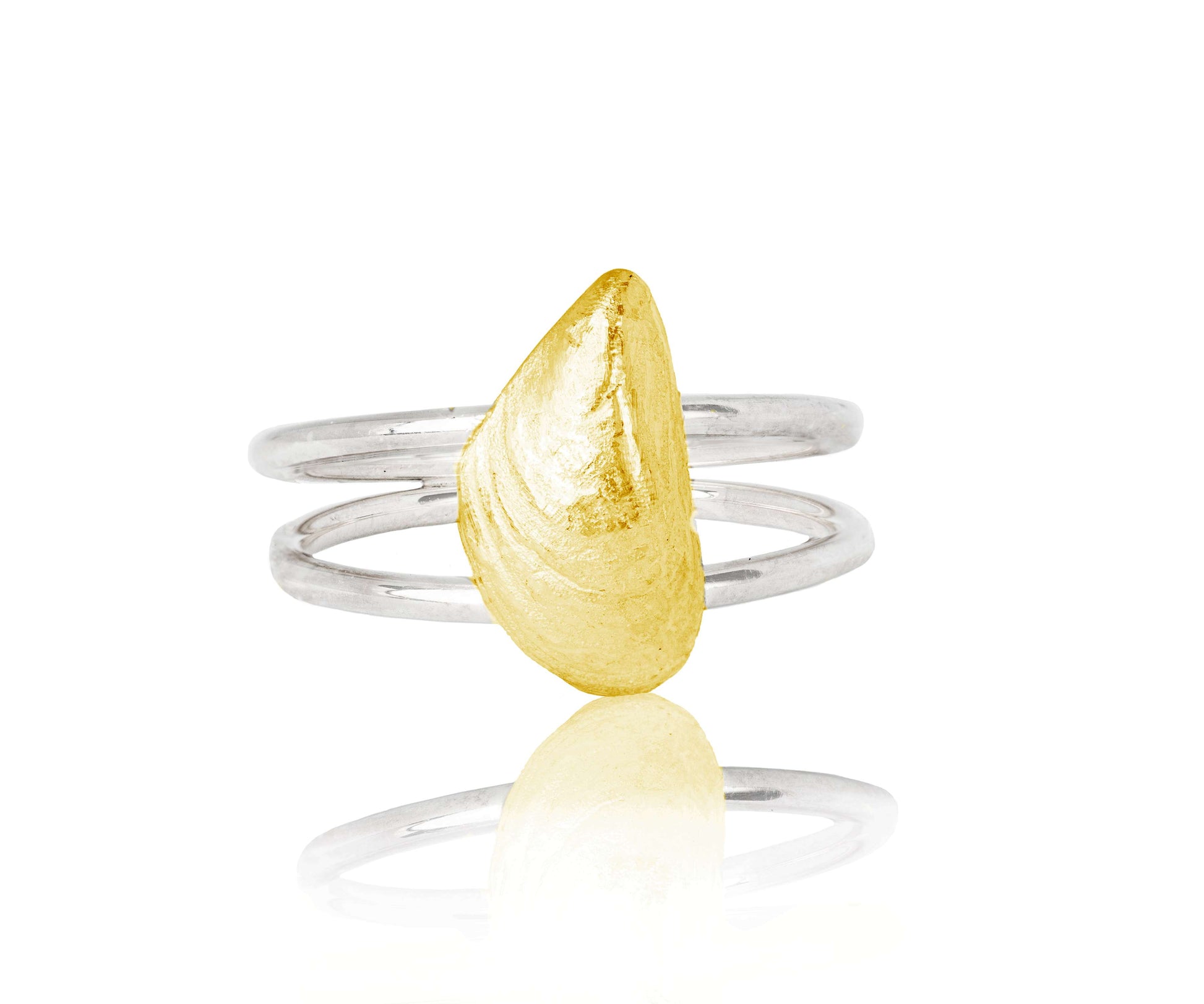 Die kleine Miesmuschel aus Glücksburg in 585/- Gelbgold als Fingerring auf doppelter Ringschiene in 925/- Silber in den Ringweiten 50, 52, 54, 56, 58, und 60.