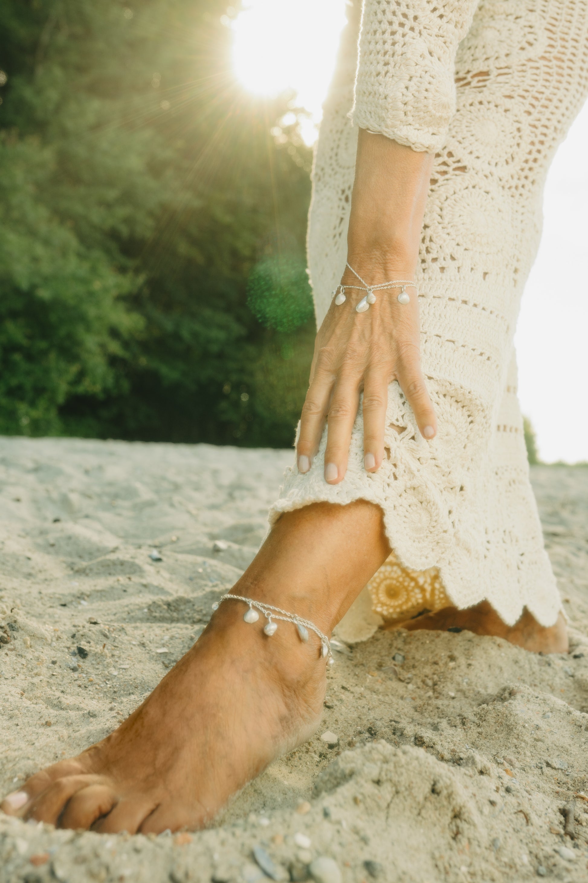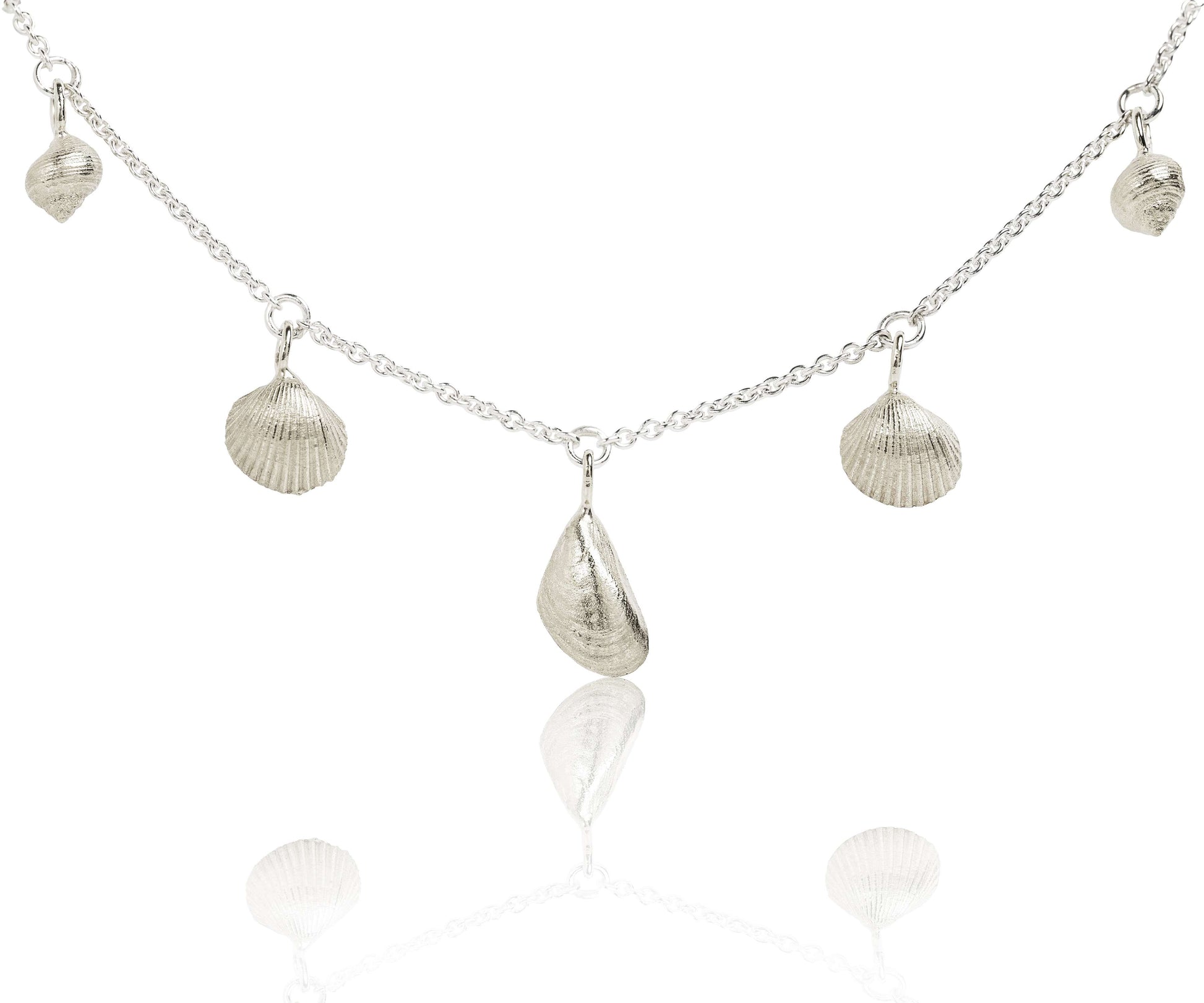 Der Fördemix mit 2 Schnecken aus Holnis, 2 Herzmuscheln aus Wassersleben und einer Miesmuschel aus Glücksburg in 935/- Silber an einer 925/- Rundankerkette in Silber für den Arm